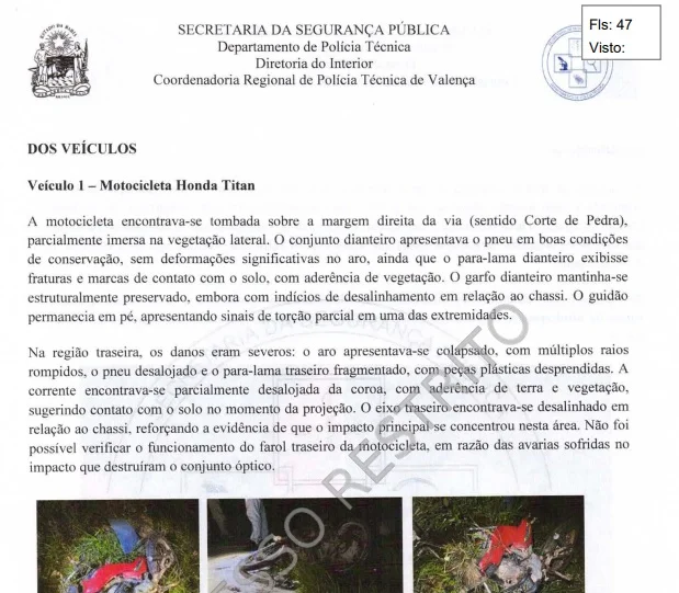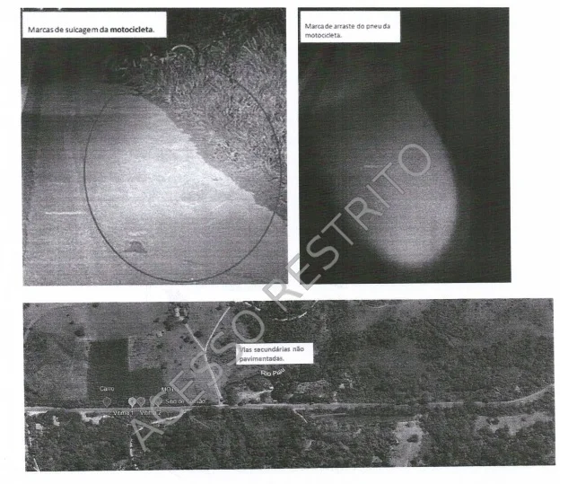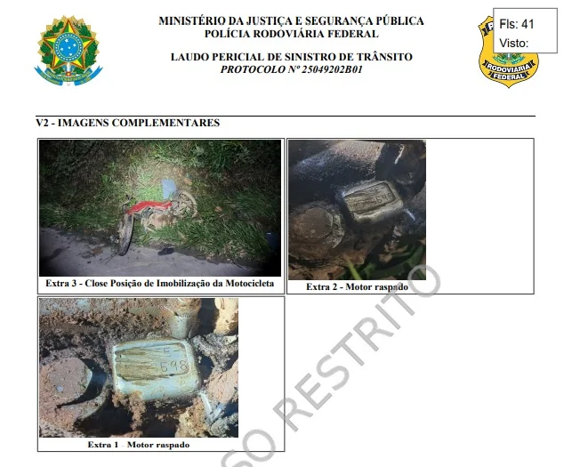 O DPT ainda atestou que a moto usada pelos irmão e pelo pai tinha numeração do motor raspada. "Com aspecto abrasivo, em padrão não compatível com atrito decorrente do acidente. Quanto ao chassi, a área destinada à numeração encontrava-se suprimida, não sendo possível a leitura dos caracteres originais. A placa de identificação veicular não foi localizada no local do exame", pontuou ainda o perito.