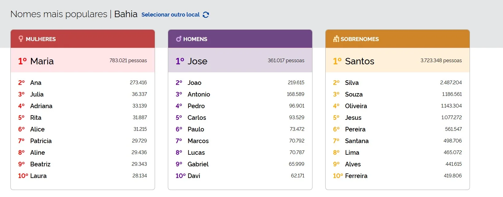 Na Bahia, são 783.021 pessoas com o nome de Maria. Com José, são 361.017. Ana, Julia, Adriana e Rita completam a lista dos cinco nomes mais comuns, entre as mulheres, no estado. João, Antônio, Pedro e Carlos são, ainda, os mais comuns entre os homens. Já o sobrenome Santos aparece em 3.723.348 pessoas. Silva, Souza, Oliveira e Jesus completam o dado.