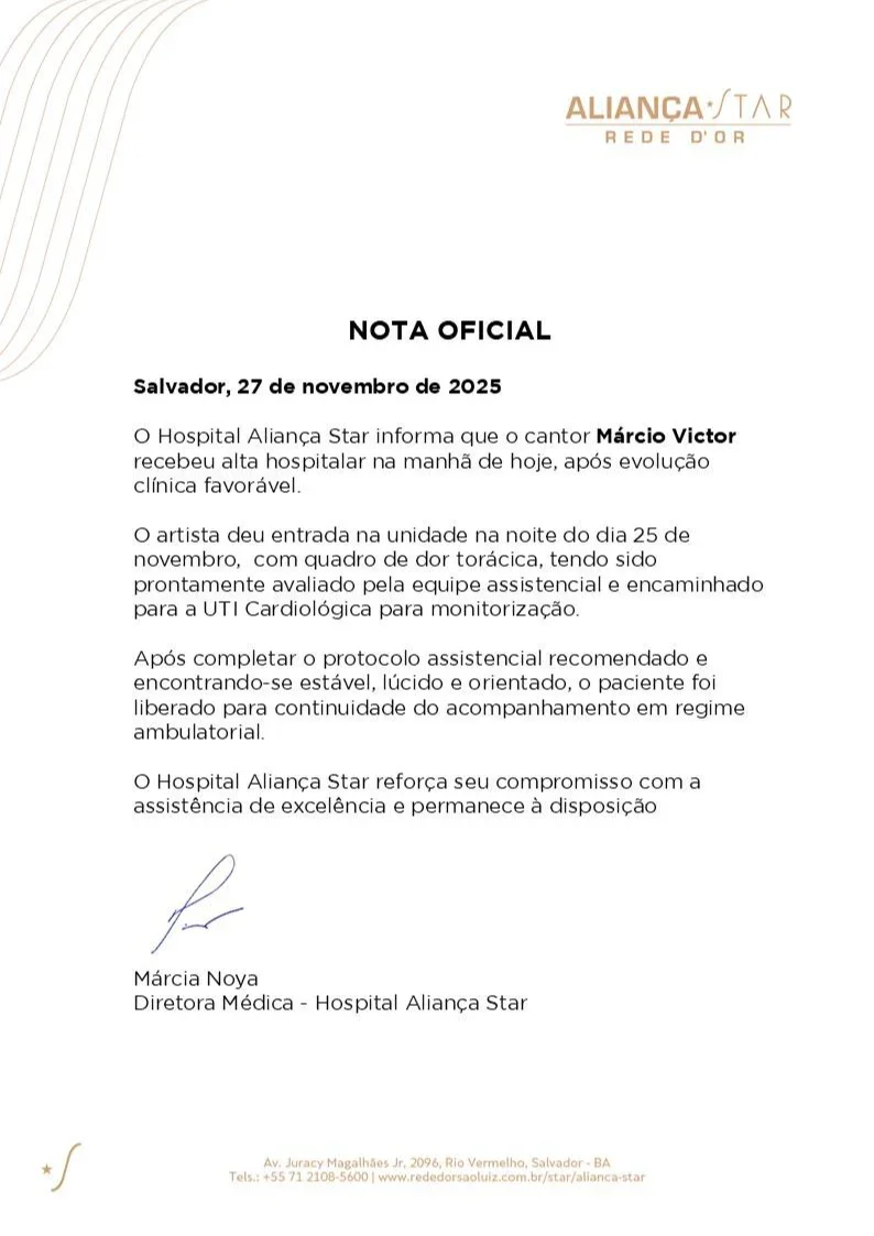 O cantor Márcio Victor, vocalista do Psirico, recebeu alta na manhã desta quinta-feira (27) após passar dois dias internado no Hospital Aliança Star, em Salvador. Ele deu entrada na unidade na noite de terça-feira (25), após sentir fortes dores no peito, dormência no braço e mal-estar, sendo levado imediatamente para a UTI cardiológica.